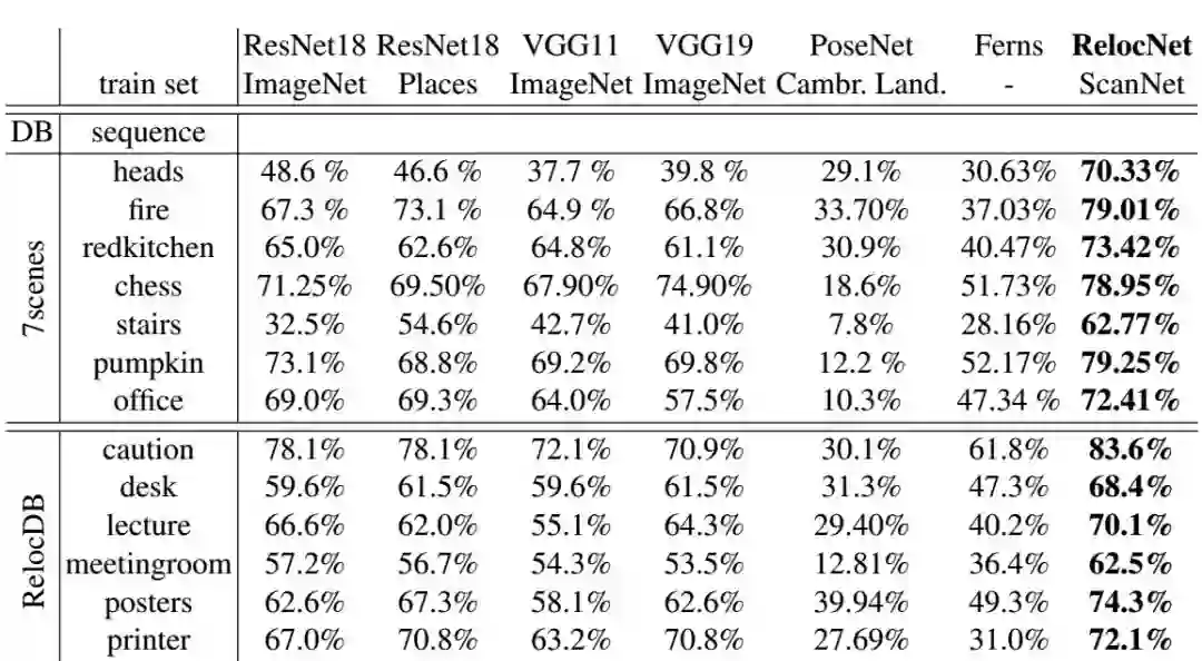 表1中显示了在7Scenes和RelocDB数据集中,视锥重叠阈值设为0.7时的重定位成功率。可以看到,我们的描述符在重定位方面,明显优于其他方法,匹配成功率大致在70%。