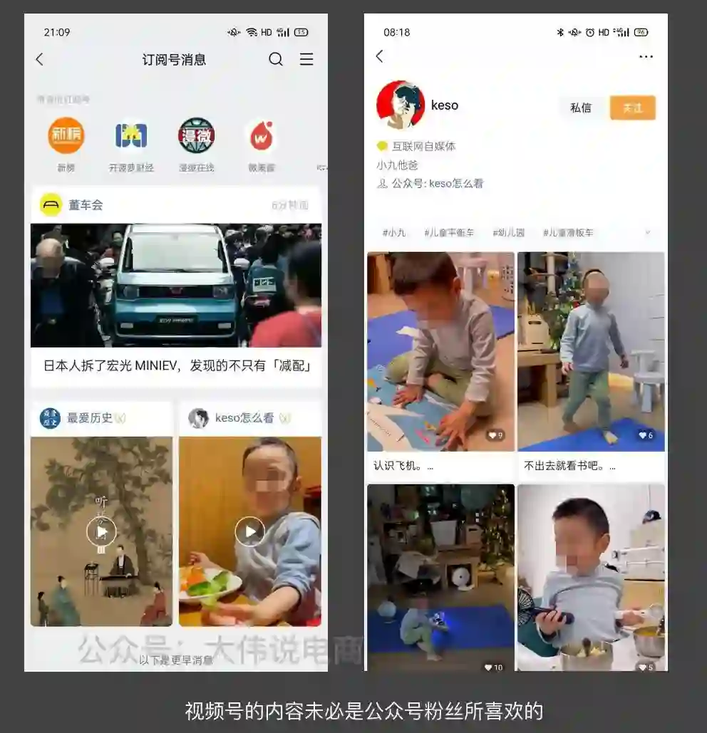 但 Keso 老师的视频号基本全部都是自己娃的日常(我没有别的意思,只是举个例子),但相比他写的文章,我不得不承认,对 keso 老师发的视频号的内容相对就不太感兴趣,刚开始还会看两眼,后来就直接忽略了(再一次声明,我对 keso 很尊敬,没有别的意思,只是举个例子)。
