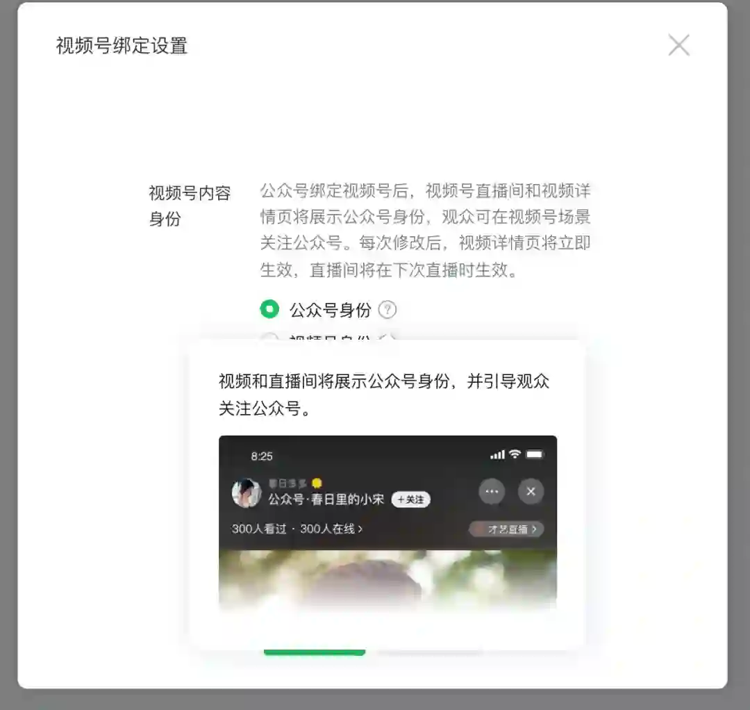 在视频号直播时,也将展示公众号身份并可以引导粉丝关注公众号。