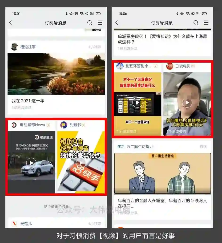并且经大伟本人实测:即使用户只关注了【视频号】同时未关注其绑定的公众号,也会在订阅号消息的列表中收到视频号的内容推荐,如下图: