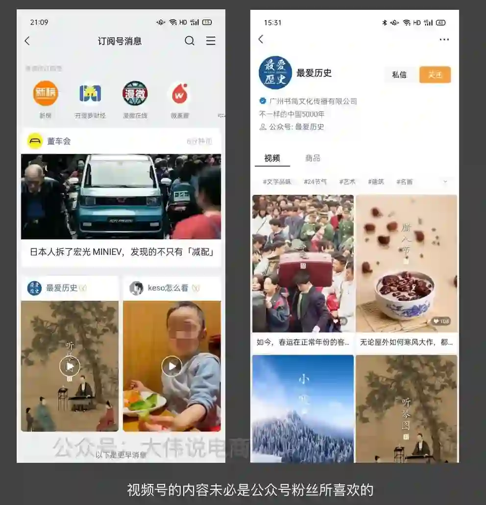 再比如我关注的:最爱历史,我通过会在比如中午午休时看它的推文,但它的视频号又发的与文章类型完全不太一样,同样的,我也丝毫没有半点兴致观看。