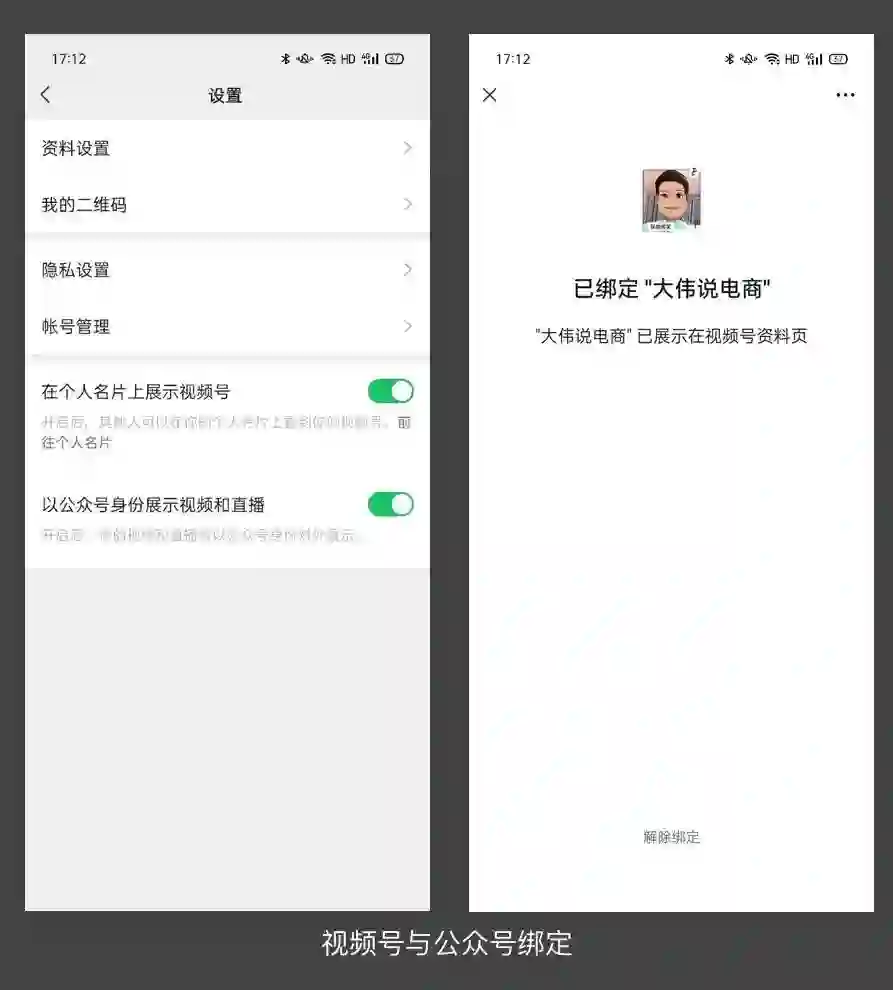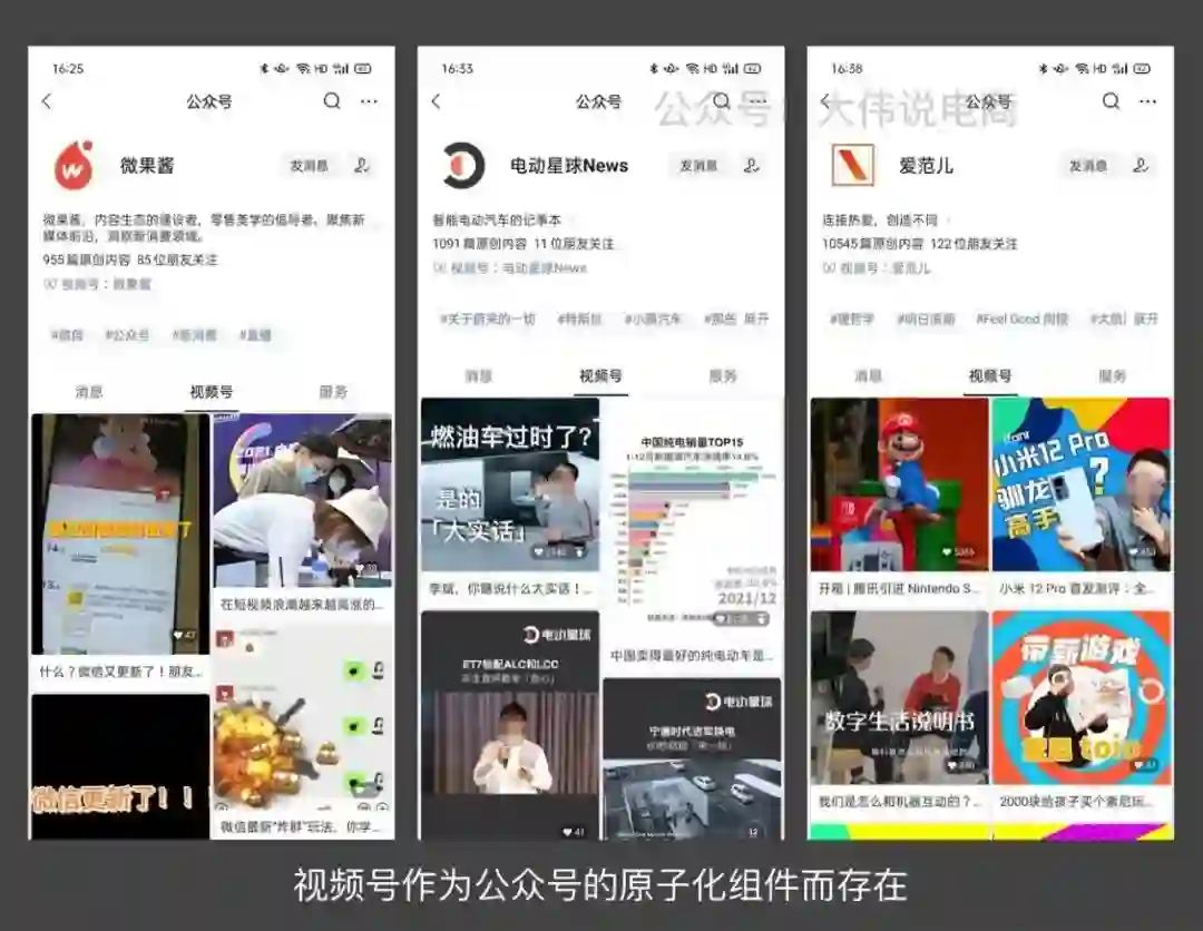 比如公众号文章支持插入视频号卡片、支持公众号和视频号绑定、订阅号消息中出现视频号视频等等。