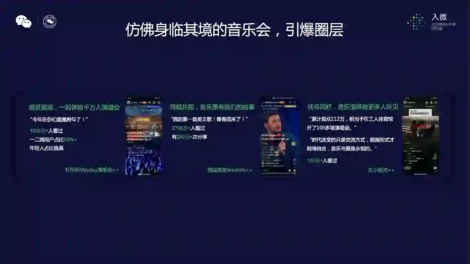 场景包括但不限于群聊、朋友圈、私聊、直播状态展示、公众号关联,以及前段时间官方运营的 westlife 和 5 月天的演唱会等,可谓无孔不入,无所不用其及。