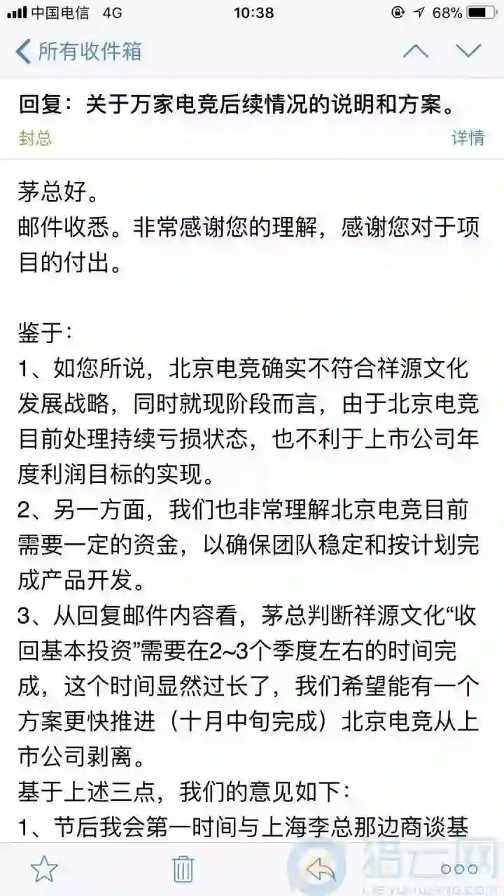 在去年8月,万家文化在迎来了接盘者——祥源集团。但是11月,根据茅侃侃提供的内部邮件显示,祥源文化方面认为万家电竞并不符合祥源文化的发展战略。而且“万家电竞处于持续亏损状态,不利于上市公司年度利润目标的实现。”祥源文化在与茅侃侃邮件往来中表示,希望万家电竞能在十月中旬就从上市公司剥离。在茅侃侃看来,这在短时间内不可能实现,至少要在2、3个季度左右时间才能完成。