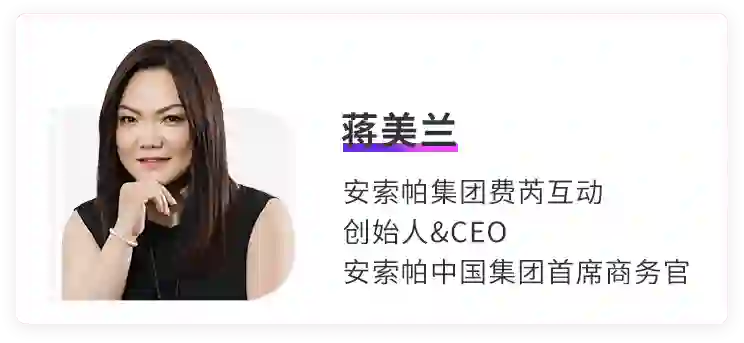 拥有21年研究零售业、广告及新媒体领域经验的安索帕集团费芮互动创始人&CEO@蒋美兰,分别有着10年零售业、10年广告业、6年新媒体的经历。