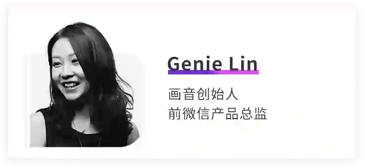 画音创始人@ Genie Lin是微信团队创始成员,她深度参与并见证了微信从0到10亿用户的完整过程。
