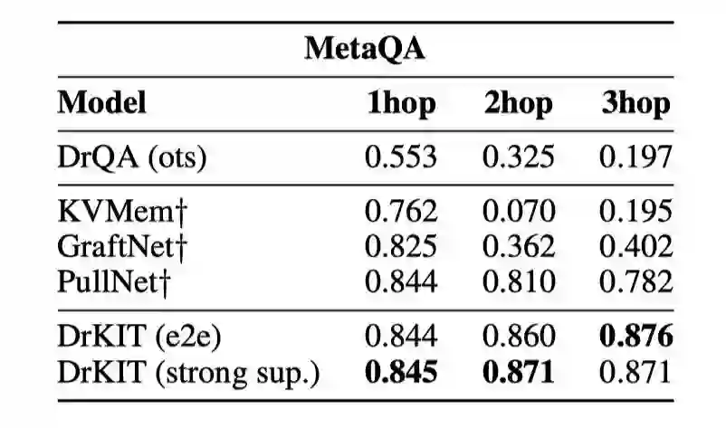 本文将这一新系统称为DrKIT (提取自Differentiable Reasoning over a Knowledge base of Indexed Text)。研究者在针对复杂问题回答的MetaQA基准上进行了DrKIT的测试,结果展现了,相对于先前基于文本的系统,此方法在两跳问题上提高了5个百分点的性能,在三跳问题上提高了9个百分点的性能,从而将基于文本和基于知识库两种系统的差距分别降低了30%和70% 。
