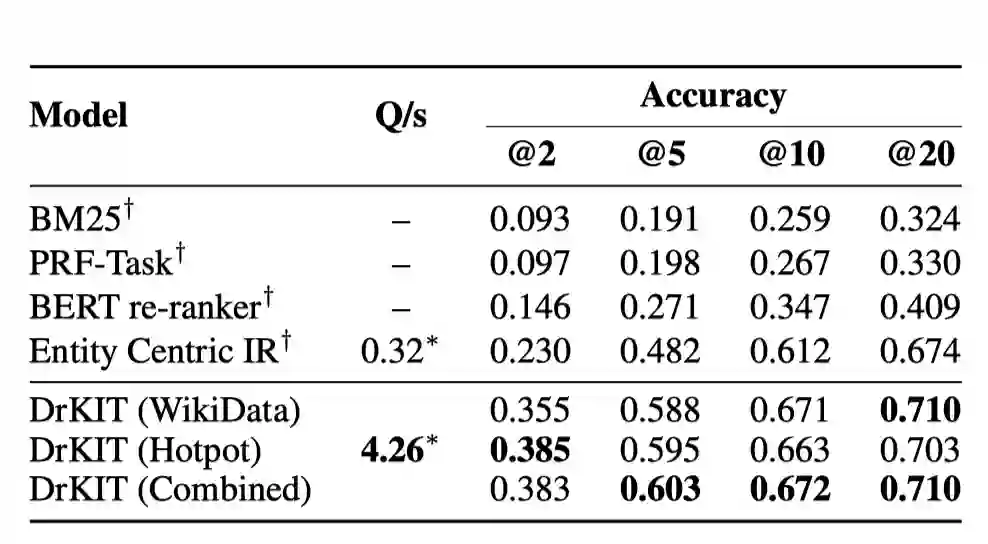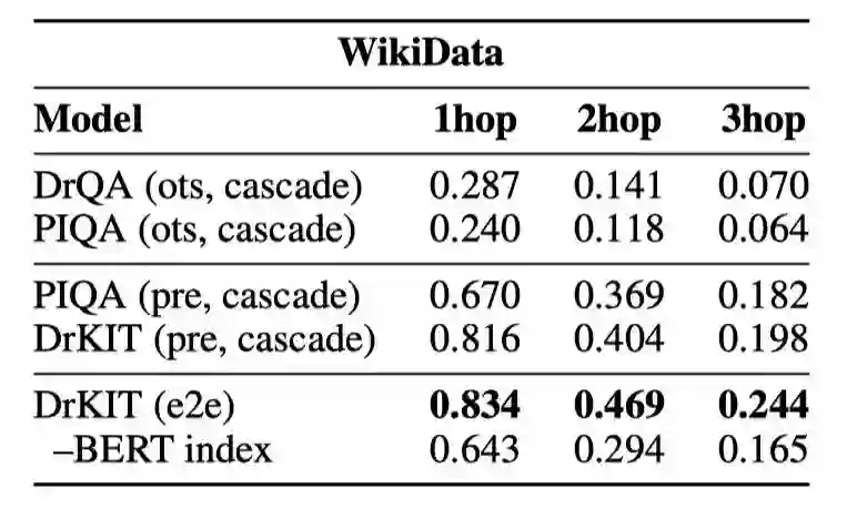 实验结果说明,DrKIT的准确率超越了前人的方法,在2跳和3跳问题上表现出了尤为突出的性能。