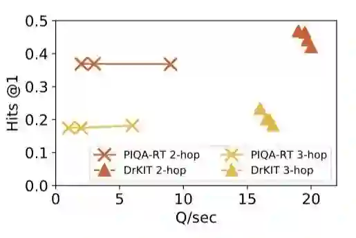下图显示了PIQA和DrKIT两种方法的准确率和查询时间的权衡,我们可以观察到,由于实体提及扩展这一处理过程,DrKIT的运行时间增加了2到3倍。