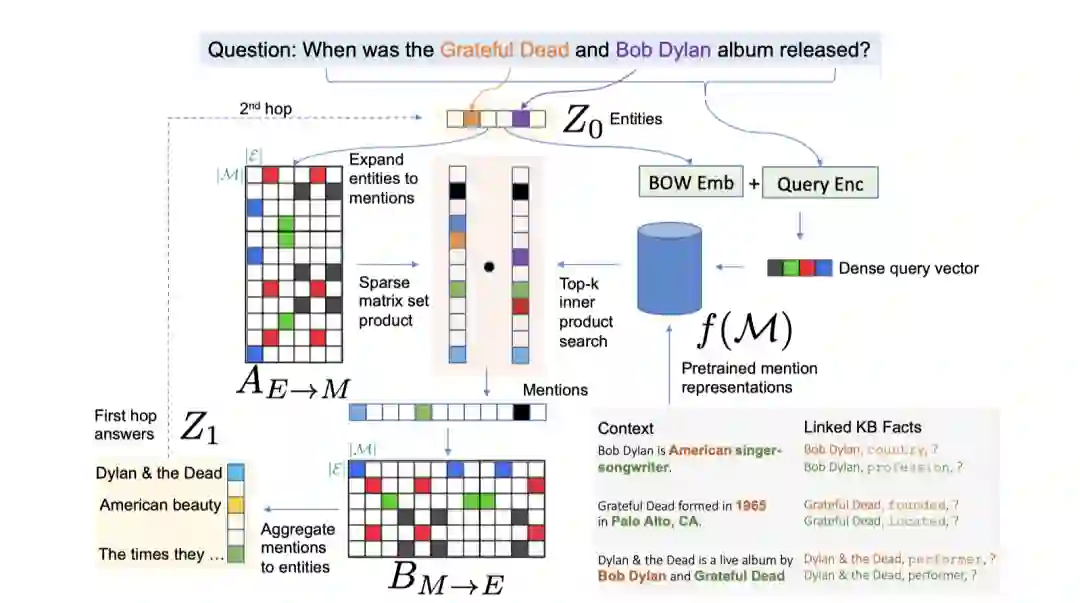 上图表示DrKIT通过迭代地将输入实体集X(The Grateful Dead, Bob Dylan)映射到输出实体集Y(Dylan&the Dead, American beauty ,...)来回答多跳问题的过程,Y依据关系R(album by)和输入实体集相关。