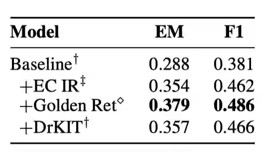 下图是2018年研究人员提出的基准,我们可以看到,和该基准相比,DrKIT都有明显优越的性能表现: