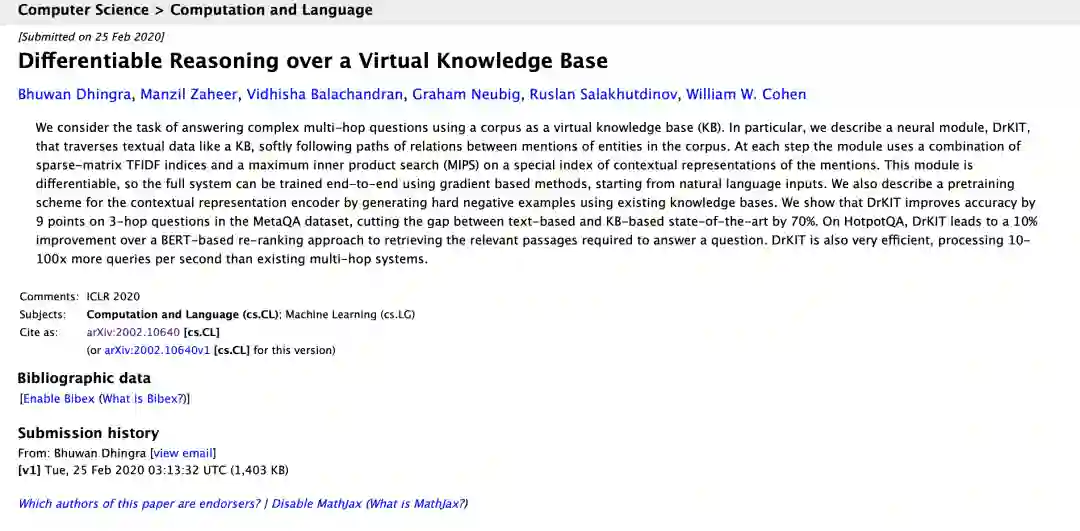 对于知识图谱的研究在最近几年呈现逐渐热门的趋势,在今年的ICLR2020上,就涌现出了大量相关研究,其中,来自CMU和Google的研究者提出了一种新的将语料库作为虚拟知识库(Virtual Knowledge Base,KB)来回答复杂多跳问题的方法,其可以遍历文本数据,并遵循语料库中各个实体的关系路径,并基于评分的方法,实现了整个系统端到端的训练。实验结果证明此模型可以快速地实现更好的性能。