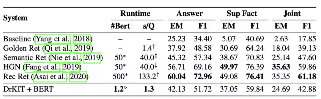 最后,研究者还将DrKIT应用于在HotpotQA数据集(Yang等人,2018)的多跳信息检索任务中,结果表明,与基于BERT的重排序方法相比,此模型可以达到10倍的加速效果 。