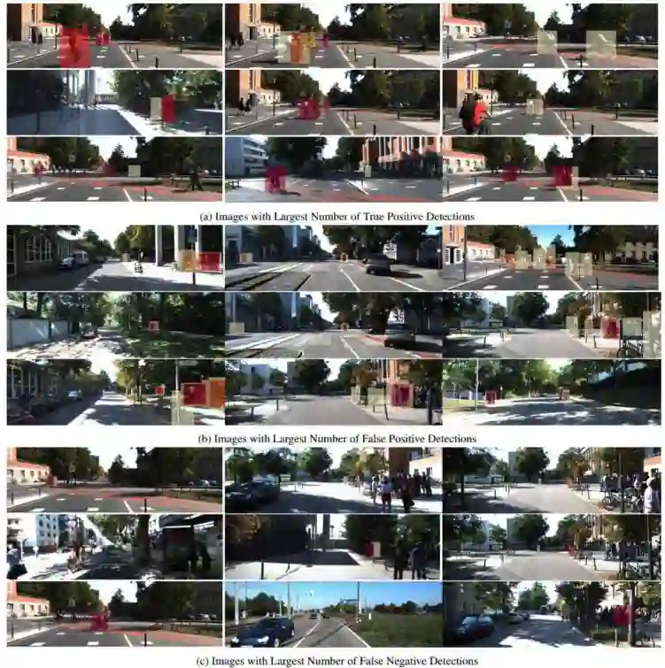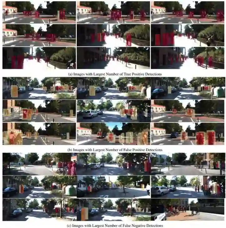 图 10:KITTI 行人检测分析。每个部分分别展示了包含大量真正例(TP) 检测、假正例(FP)检测和假负例(FN) 检测的图像。如果所有的检测器的 TP、FP 或 FN 一致,目标被标记为红色。如果只有一部分检测器一致,目标标记为黄色。通过 KITTI 评测服务器上公开的 15 种顶级方法,我们已经建立了排名。