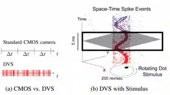 图 4(a)一个标准的 CMOS 摄像头以固定帧频输出图像,运动视觉传感器(DVS)及时输入波峰事件(spike event)(当他们变红时)。每个事件对应一个局部、像素级别的亮度变化。(b)DVS 盯着一个旋转点上的输出视觉化。用颜色的点用于标记个体事件。不属于螺旋的部分是由传感器噪音引起的。