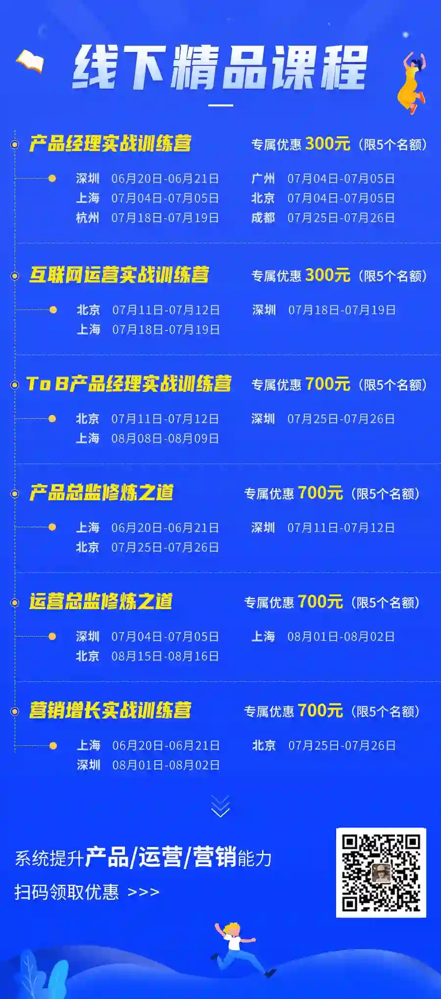 本次开放的福利课程均为起点学院深度打磨迭代的体系化课程。核心目的在于帮助大家系统提升初、中、高阶产品、运营、营销领域的能力,实现从职场专员到团队骨干、总监能力模型的晋升和跨越。