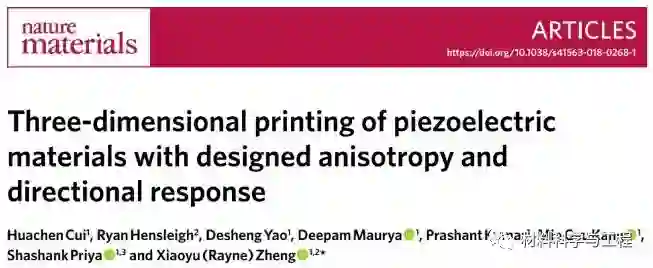 目前的压电制造工艺中的一个因素就是:采用天然晶体。在原子水平,原子的方向是固定的。Zheng 的团队制造了一种替代物,它可以模仿晶体,但是却允许通过设计改变晶向。郑小雨表示:我们已经合成了一类高度灵敏的压电油墨,这些油墨可以通过紫外线雕塑成三维特征。这些油墨含有高浓度的压电纳米晶体。这些晶体与对紫外线敏感的凝胶粘在一起形成一种溶液,像熔融结晶一般的乳白色混合物。然后,我们通过高分辨率的数字光3D打印机来打印。团队通过可以测量人类发丝直径的分数的比例尺,演示了这种3D打印的材料。可以定制这种架构,使之更具柔性,并使用它们,例如作为能量采集器件,包覆任意曲面。