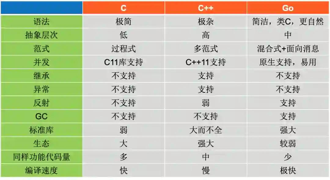 Go是介于C与C++之间的语言,比C抽象层次高,比C++抽象层次低。