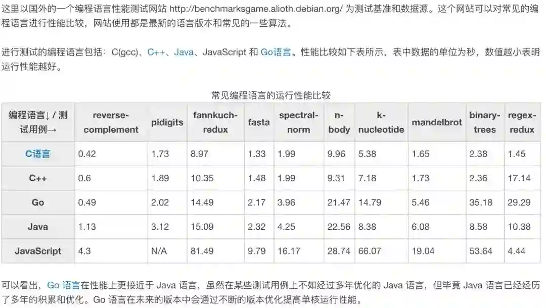 虽然Go号称兼备C++的运行效率和PHP的开发效率,但benchmarks好像并不支持这个结论,数据有点打脸,Go的运行效率接近却略低于Java。
