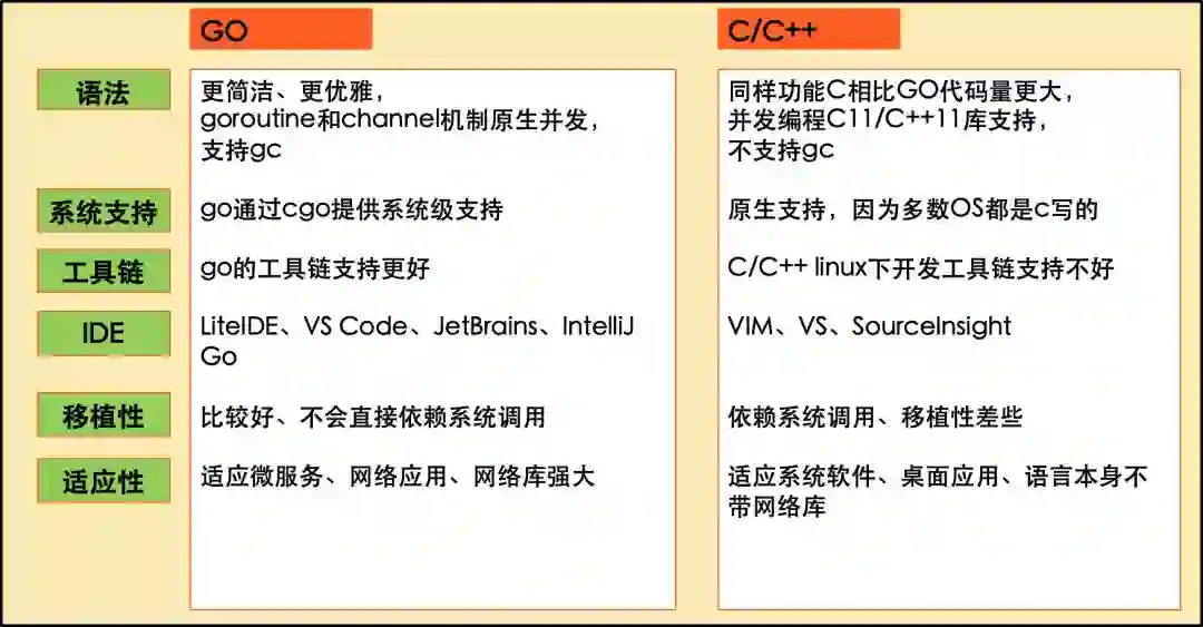 因为是一门新的编程语言,站在巨人的肩膀,博采众长,规避了一些已知的问题,开发了一些优秀的特征,相比C/C++,Go的核心特征包括以下几个方面: