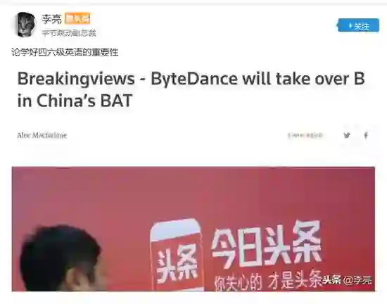 随后,字节跳动副总裁李亮也回应了。他晒出路透社文章截图,评论称“论学好四六级英语的重要性”,暗指百度错误理解标题中“take over”的意思,原文意指头条取代百度,而非百度收购头条。