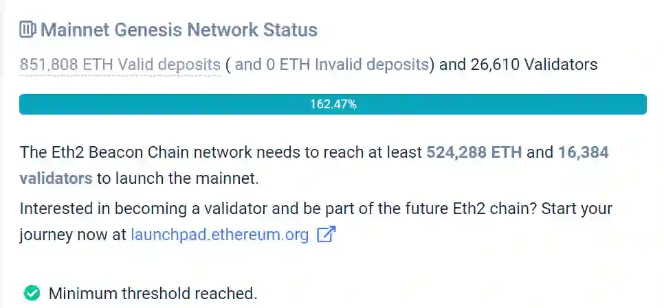 直到 11 月 24 日,用户必须向该储蓄合约中总计存入 524288 个以太币(最低参与门槛为 32 个以太币)。启动 ETH 2.0 第零阶段的另一个条件,是至少吸引到 16384 位验证者的参加。