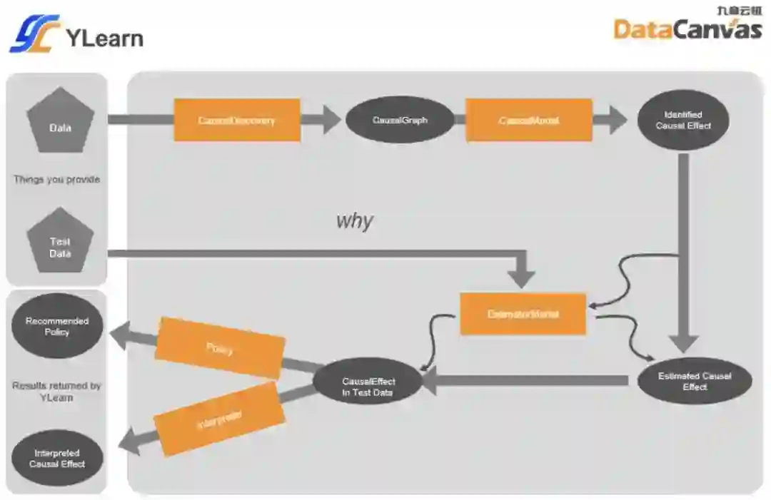 这些不同的部分通过组合,可以完成一个完整的因果学习相关流程,为了方便使用,YLearn 也将它们一起封装在 Why 这个统一的 API 接口中。