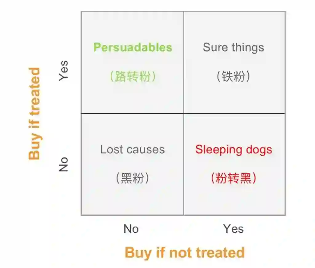 因果学习其中有一个重要的应用就是 Uplift 建模,直接字面理解就是提升建模,提升的是什么可以认为提升 ROI(投入产出比),非常适合用在精准营销上面。提升建模的核心是把目标用户分到 4 个象限里。