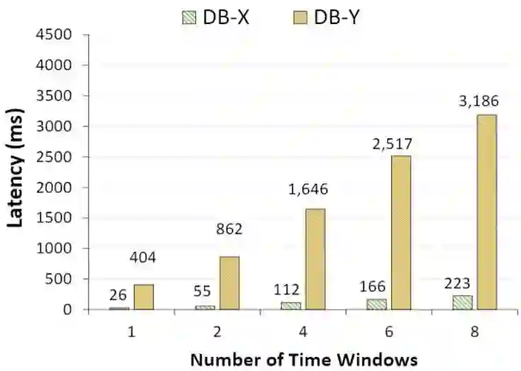 我们选取了两种目前最先进的主流商用内存数据库(DB-X 和 DB-Y),使用典型的实时特征抽取负载进行性能测试。如图 3 所示,随着时间窗口数的增加,DB-X 和 DB-Y 的查询延迟显著上升,且当窗口数大于 4 之后,两种数据库的查询性能均已经超过 100 毫秒,完全无法满足我们的性能需求。而且在真实业务场景下,时间窗口数远远大于 4。基于以上结果,需要我们设计一个新的专门针对人工智能特征抽取的数据库引擎。