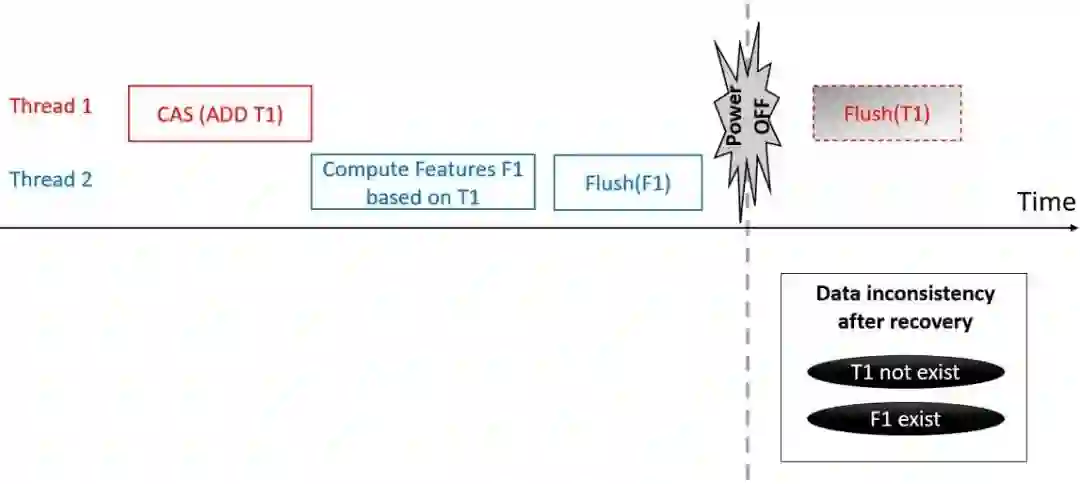 如图 9 所示,一个典型的场景是当一条新的信用卡刷卡记录 T1 在 Thread 1 上通过 CAS 插入 OpenMLDB,紧接着另外一个线程 Thread 2 基于新的记录 T1 抽取特征 F1。由于 CAS 和 CPU 的 flush 指令相互独立,传统的基于 DRAM 的 CAS 并没有持久化语义,如果系统按照图 9 的顺序持久化 F1 和 T1(即图 9 中的 flush 指令),而在两个 flush 命令中间掉电,重启之后在系统上新的信用卡记录 T1 会丢失,但基于 T1 计算出的特征 F1 却存在,这在一致性上显然是不正确的。