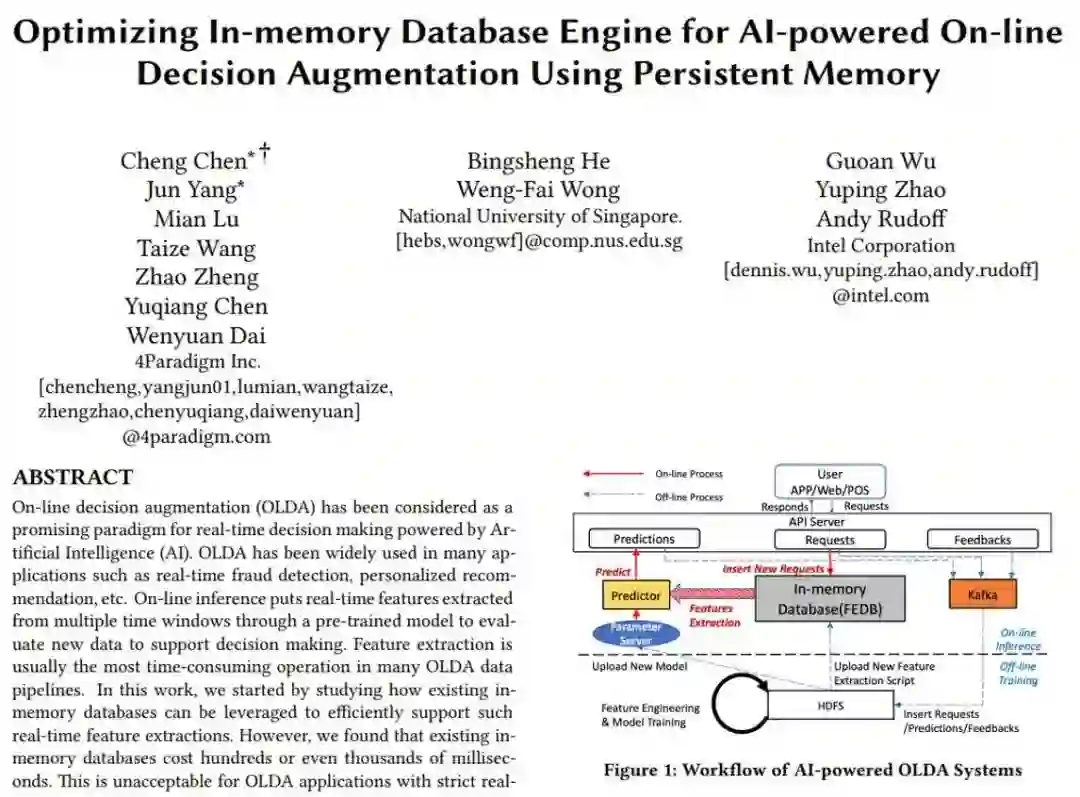 OpenMLDB(Open Source Machine Learning Database)是第四范式自研的开源机器学习数据库。此次被录用的论文由第四范式 AI 基础技术研发团队和新加坡国立大学及 Intel 合作发表,题为《Optimizing In-memory Database Engine For AI-powered On-line Decision Augmentation Using Persistent Memory》。
