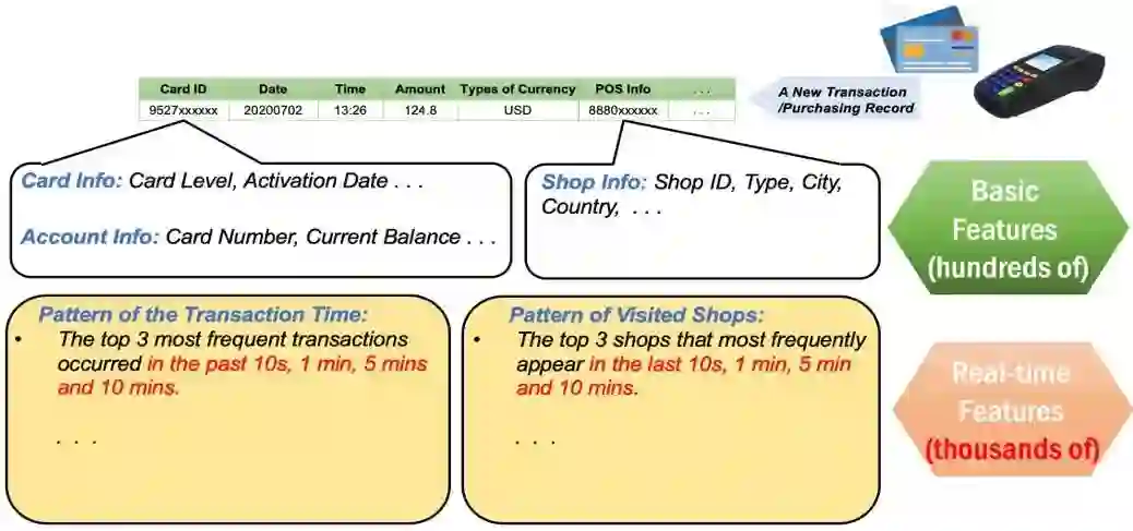 如图 2 所示,通过 Card ID, 我们可以通过查询特征数据库了解这张卡的信息和与之关联的账户信息。还可以通过基于时间窗口的计算,进一步了解这张卡的最近 10 秒、1 分钟、5 分钟、10 分钟的信用卡消费总额最多的三个店铺等信息。这些特征需要从用户近期的历史数据中实时抽取。一般来说,特征抽取数量越多,模型预测约准确。