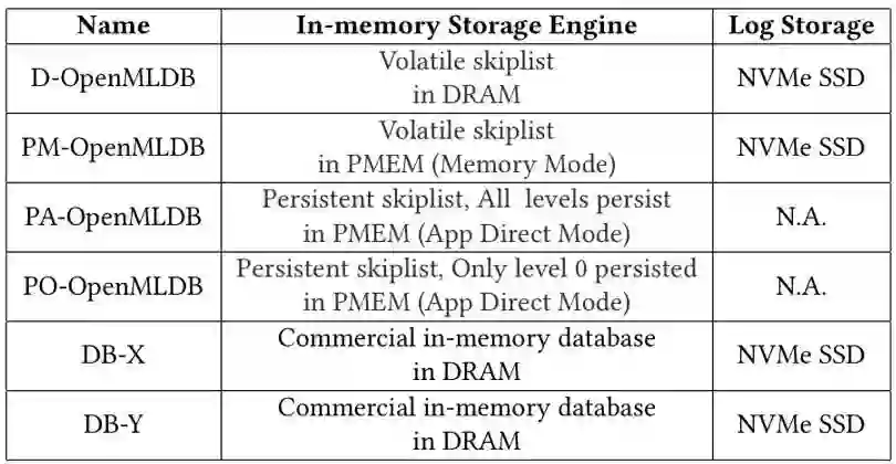 我们使用一个真实的反欺诈应用数据进行测试,该数据包含了 3 个月的 10 亿条刷卡记录信息,实际部署中大概需要 10 TB 的内存空间。我们对比了 DRAM 版本的 OpenMLDB 以及各种持久内存版本的 OpenMLDB 变种,图 12 给出了测试中各种数据库系统的配置。该实验得出以下结论。