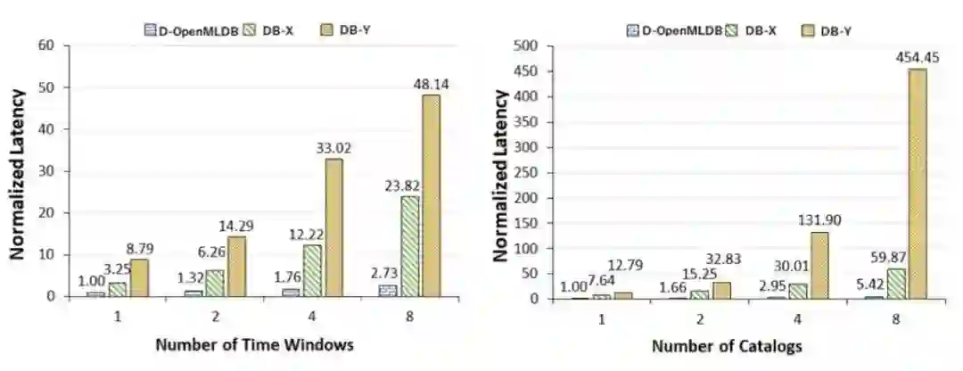 如图 7 所示,图中 D-FEDB(即 D-OpenMLDB)表示 DRAM 版本的 OpenMLDB。我们在 DRAM 版本 OpenMLDB、商用内存数据库 DB-X 和 DB-Y 上变换时间窗口个数和特征主键数目,并运行典型的特征抽取查询对比性能。如图所示,DRAM 版本的 OpenMLDB 的性能远远高于传统商业数据库,最高可达 84x 的性能提升。