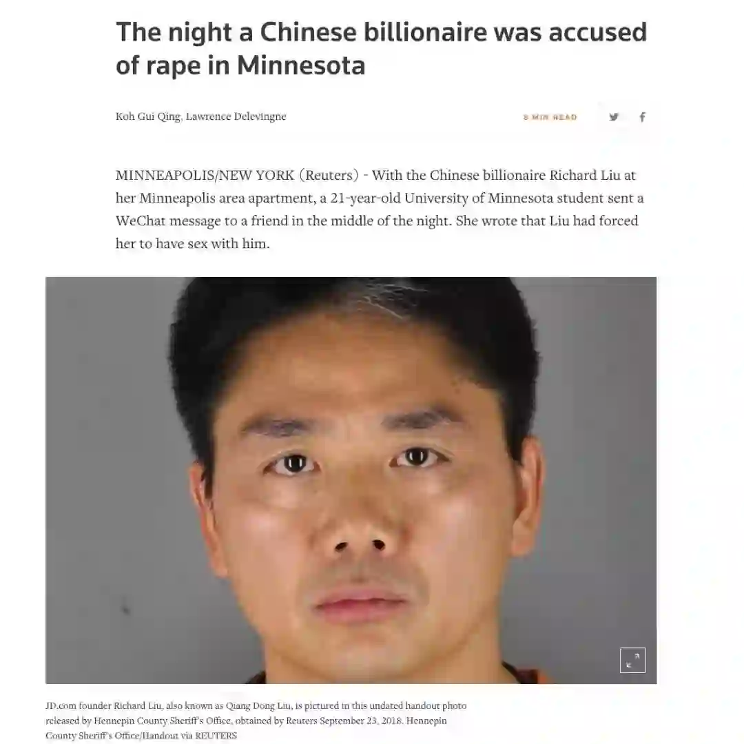 路透社今天公布了刘强东性侵案的更多细节。文章称,21岁的明尼苏达大学女学生半夜向好友发微信称,刘强东已强迫她与其发生性关系。