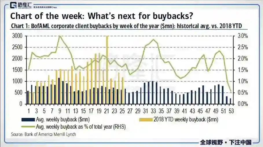 美国银行7月份发布了一份他们客户的回购数据,下图黑色柱条代表历史平均的回购购买金额,黄色柱条是2018年的回购金额数据。可以看到今年他们的企业客户回购额大大超过了历年同期平均水平。这主要得益于美国减税,允许公司使用汇回的现金回购股票。