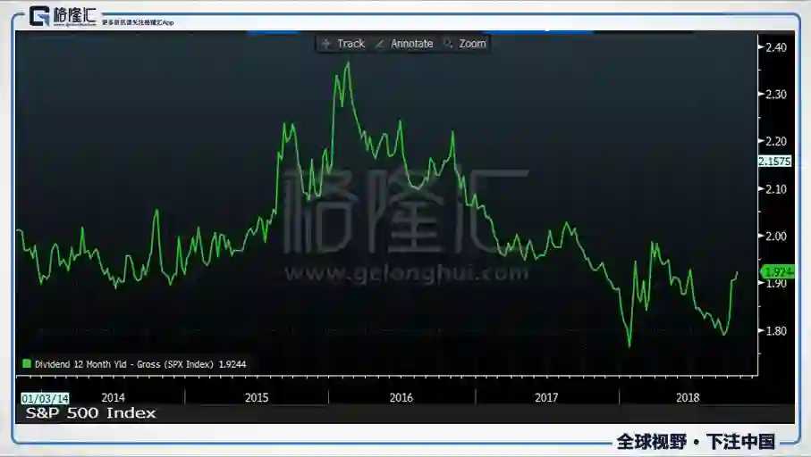 大家都知道美国国债收益率是所有美元资产的收益锚。标普500股息收益率从2014年开始一路下行,到现在是1.9%,而10年期国债收益率已经飙到了3.25%,而且预计还会保持上行通道。