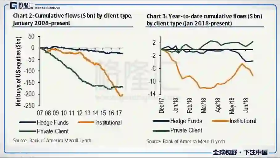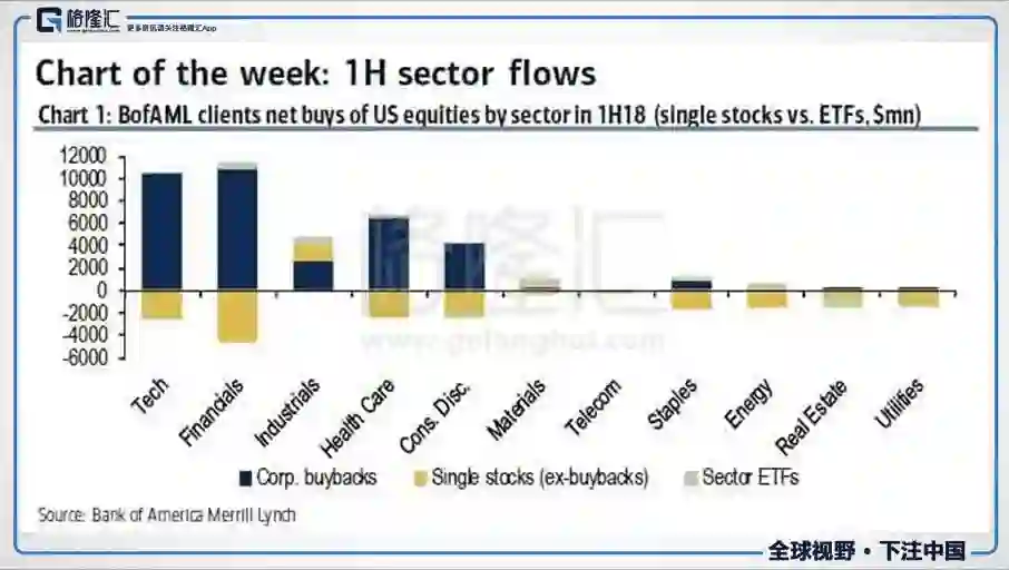按美银美林的研究,上半年科技股的涨幅几乎是上市企业回购潮推动的。可以看下美银统计的股票购买数据,公司和个人投资者是美股上半年的买家,也就是说ETF基金一直在流出。其实不止是科技股,金融、工业品、可选消费品板块都是差不多态势——这意味着所有其他客户都在卖,那么可以估计机构投资者是美股最大的卖家,其中对冲基金同期卖出金额也很大。