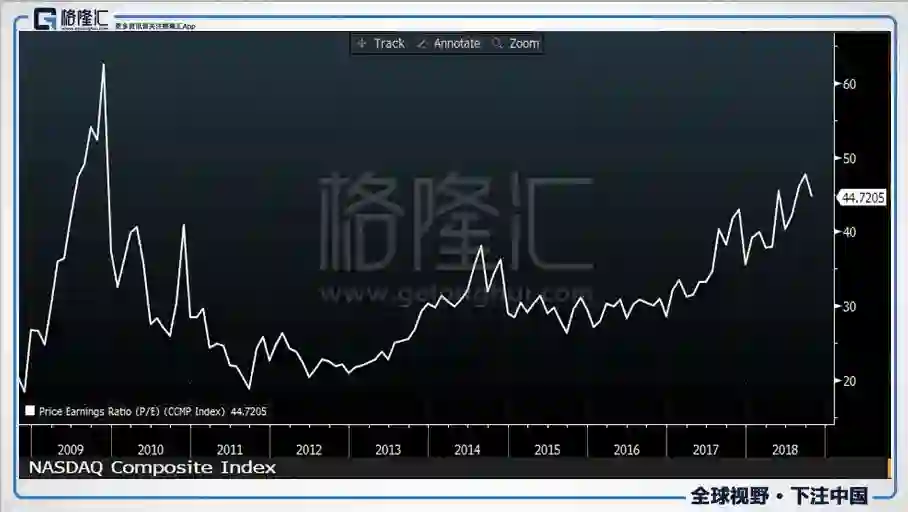 现在标普500指数PE到了19.5,而纳斯达克指数PE已经到了44.7。从十年的期的数据来看,无论是标普500还是纳斯达克,现在的PE估值都已经到了比较高的位置了。