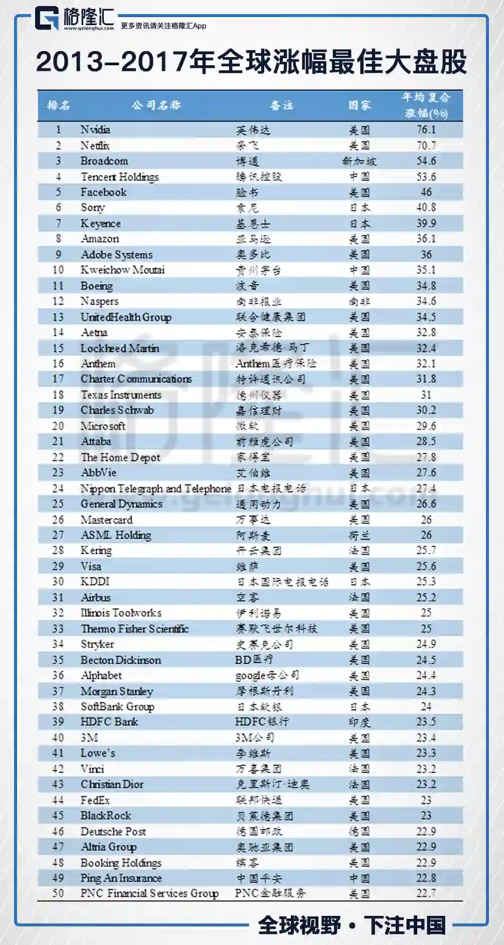 BCG咨询之前出了一份2013-2017年全世界的大市值公司的涨幅排行榜,名单中美国有33家公司上榜,其中科技公司占大部分,其他的多是医疗、金融、消费。