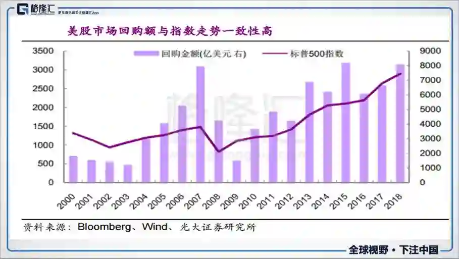 根据光大证券的统计数据,2003-2007年,美国市场回购金额从1178亿美元上涨至7920亿美元;2009年-2018年,美股市场回购金额是1472亿美元上涨至8064亿,这个回购体量是相当大的。