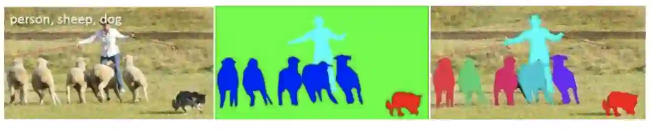 上图的示例可以看出两个任务的区别。左图中的五只羊,在语义分割任务中(中图),被赋予了同一种类别标签。而在物体分割中(右图),每只羊都被赋予了不同的类别。