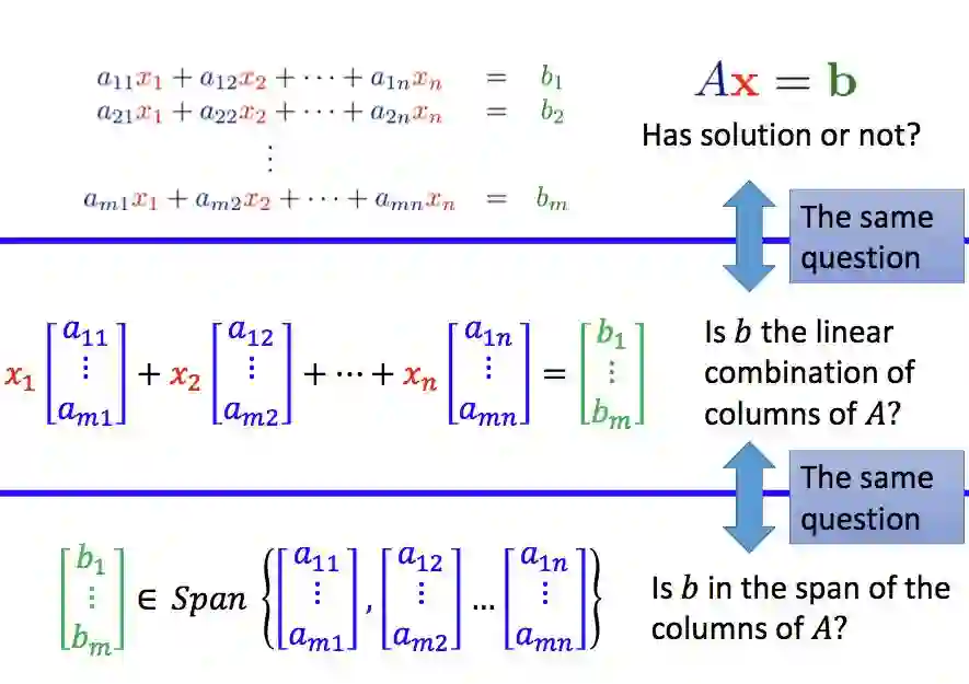 所以一个线性方程组的问题又可以转换成两一个等价的问题:向量b是否在A的列向量所张成的空间中?