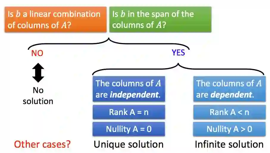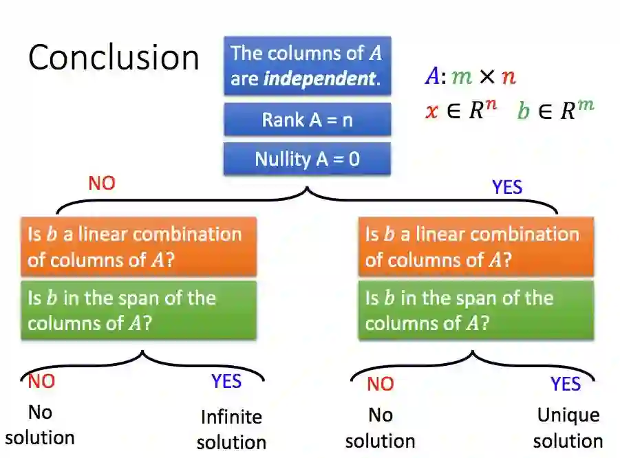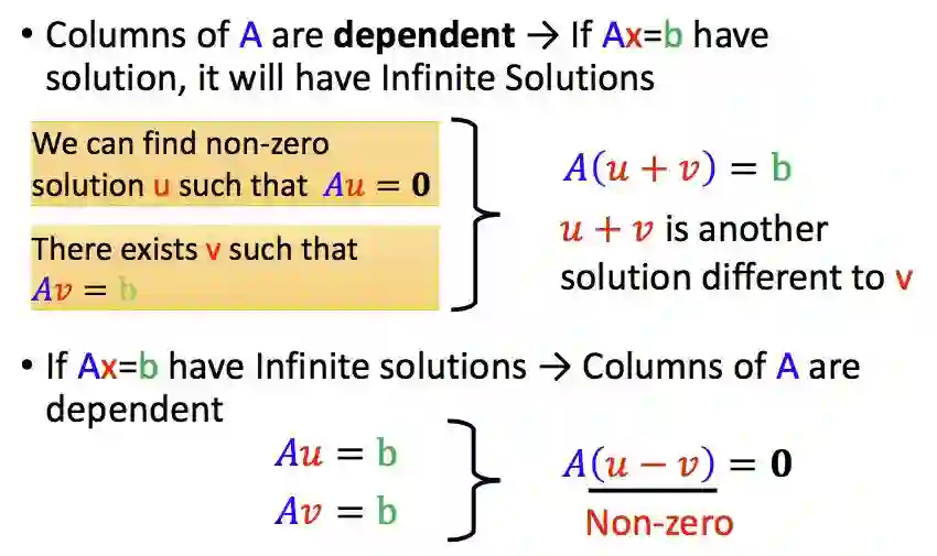 由此,对于Ax=b,我们可以得到两个结论:如果A的列是线性相关的,且Ax=b有解,那么,它有无穷多个解;如果Ax=b有无穷多个解,那么A的列是线性相关的: