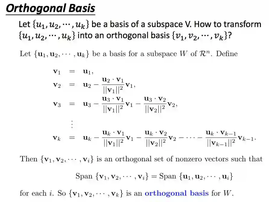 因为正交集/标准正交集中的向量是线性无关的,那么如果一个子空间的基是正交/标准正交的,那么这个基被称为正交基(Orthogonal Basis)/标准正交基(Orthonormal Basis)。
