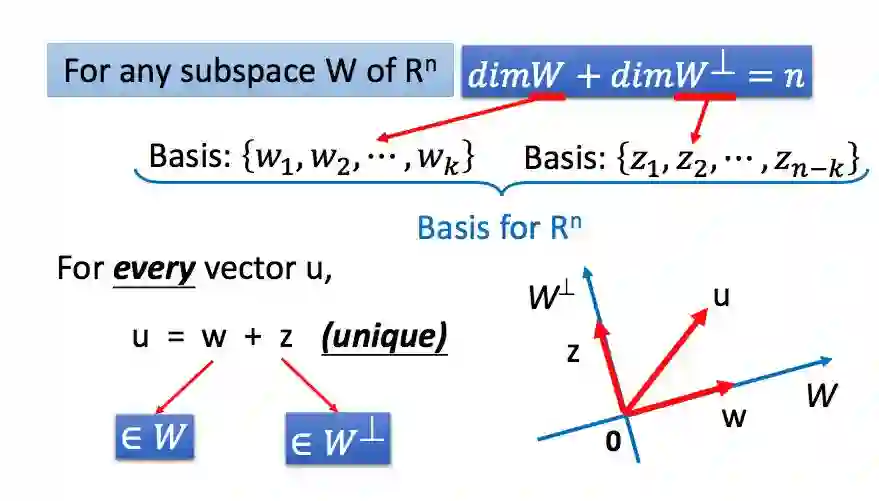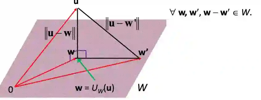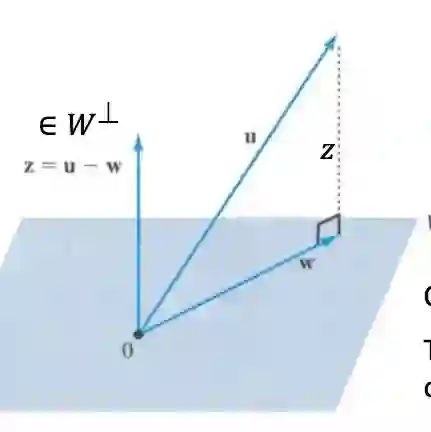 正交投影有一个很重要的性质就是,u在子空间W上的正交投影向量,是与u距离最近的,观察下图可以看出,直角三角形斜边的长度总是大于直角边的: