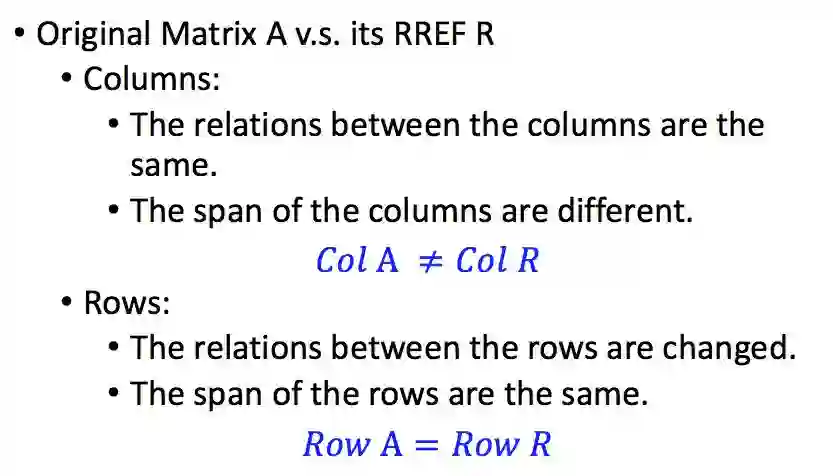 但是对于行来说,行阶梯形式改变了行之间的关系,比如原先两行是两倍的关系,其中一行变为二倍之后,二者就相等了,关系自然改变了。