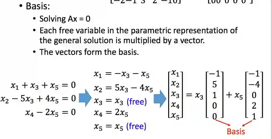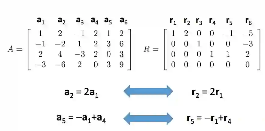 也就是说,初等行变换不改变矩阵中列之间的关系。加入A的简约行阶梯形式是R,那么Ax=0和Rx=0有相同的解集。