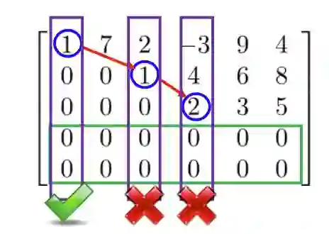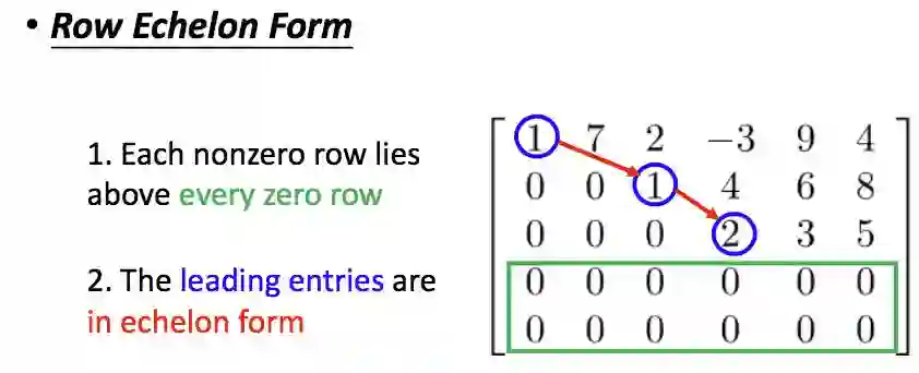 我们首先介绍行阶梯形式的矩阵,它满足两个条件,首先是非零行要在全零行的上面,其先导元素(leading entries,每行的第一个非零元素)按阶梯型排列: