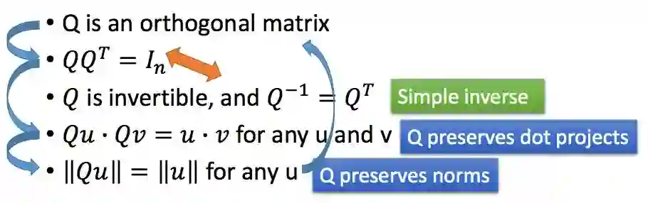 一个n阶的方阵Q,如果它的列是可以张成n维空间的标准正交基,我们就称Q为正交矩阵(orthogonal matrix)。